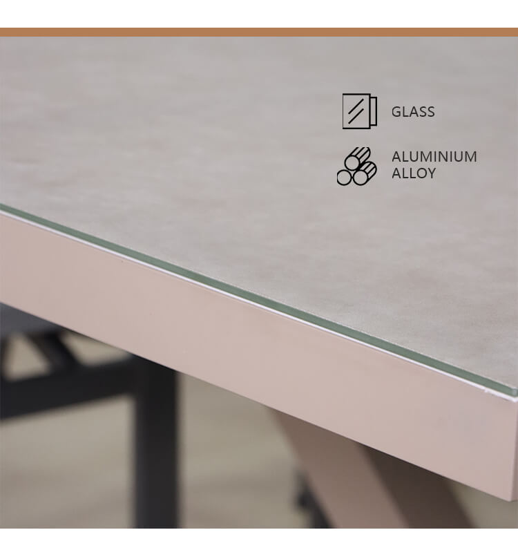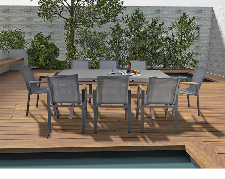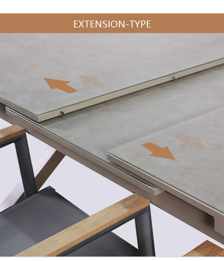 आउटडोर डाइनिंग सेट 8 सीटर बैकयार्ड फर्नीचर होटल आंगन एक्स्टेंसिबल गार्डन डाइनिंग टेबल और कुर्सी